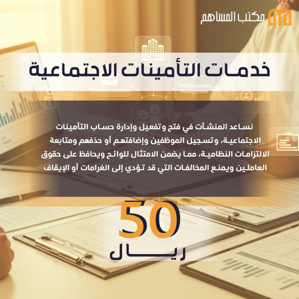 خدمة التأمينات الاجتماعية من "المساهم" تقدم لأصحاب المنشآت والشركات إدارة جميع إجراءات التأمينات بسرعة واحترافية مقابل 50 ريال فقط (غير شاملة رسوم التأمينات الرسمية).